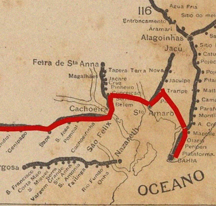 (FONTES:Lorena Silva Santos; Roosevelt Reis; Cyro Deocleciano R. Pessoa Jr.: Estradas de Ferro do Brazil, 1886; A Leste Brasileiro e o Desenvolvimento Econômico da Bahia, 1960; IBGE: Enciclopédia dos Municípios Brasileiros, vol. XX, 1958; Guia Geral das Estradas de Ferro, 1960; Mapa – acervo R. M. Giesbrecht; Foto capa: Decio Marques)