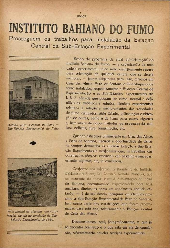 A edição de março de 1949 da revista mensal “ÚNICA”, traz reportagem sobre a construção das instalações da “Estação Central de Experimentação” do I.B.F em Cruz das Almas, bem como das “Sub-Estações Experimentais” de Feira de Santana e Inhambupe. Destaca a reportagem que a “Estação Central” de Cruz das Almas, bem como as “Sub-Estações”, destinavam-se a realizar “trabalhos e estudos técnicos experimentais relativos à seleção e melhoramentos das variedades de fumos cultivados neste Estado, aclimatação e obtenção de outras, como a de fumo para capas, cigarros e, bem assim de novos métodos ou processos de cultura, colheita, cura, fermentação, etc”.
