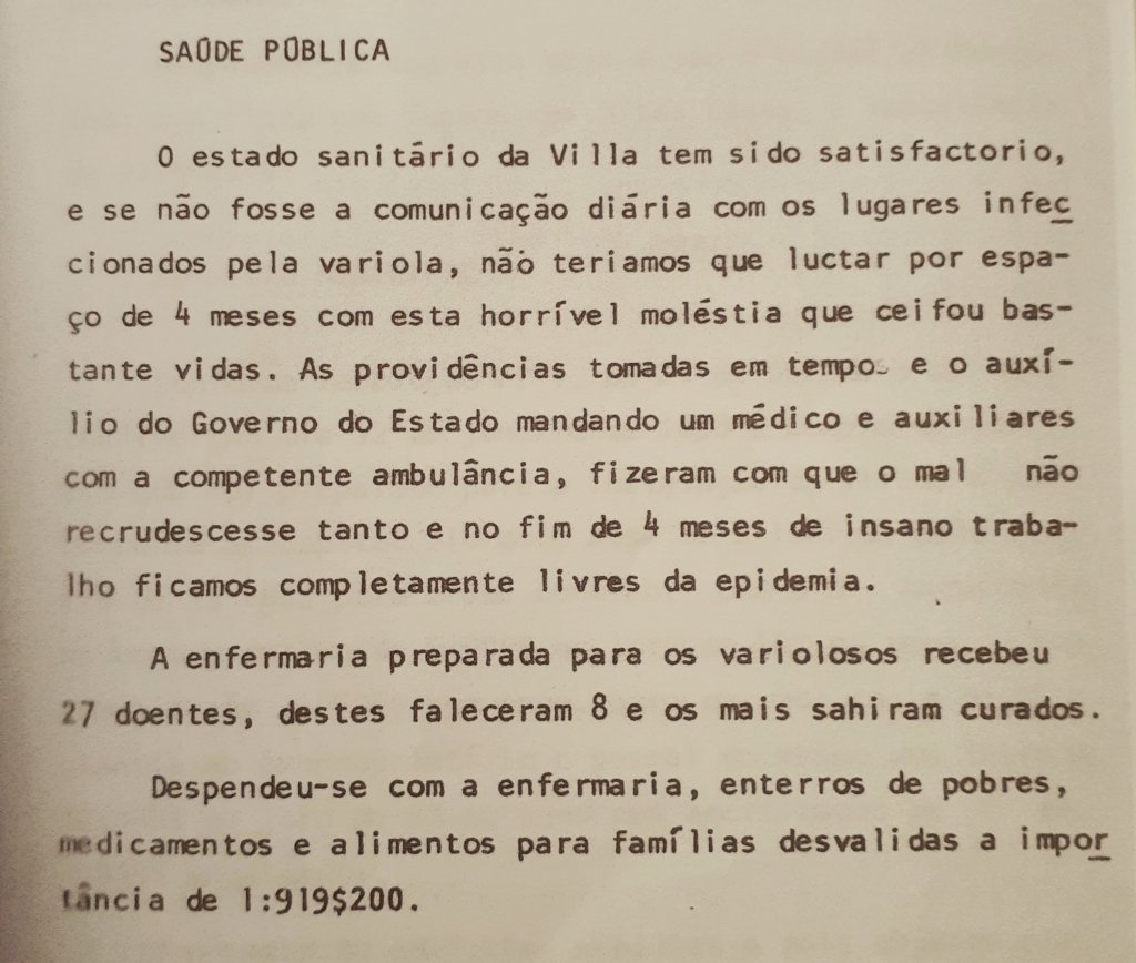 Destaque para a parte que diz: não fosse o acesso diário das pessoas frequentando os lugares contaminados pela varíola, não teríamos que lutar por 4 meses com esta moléstia que ceifou muitas vidas.