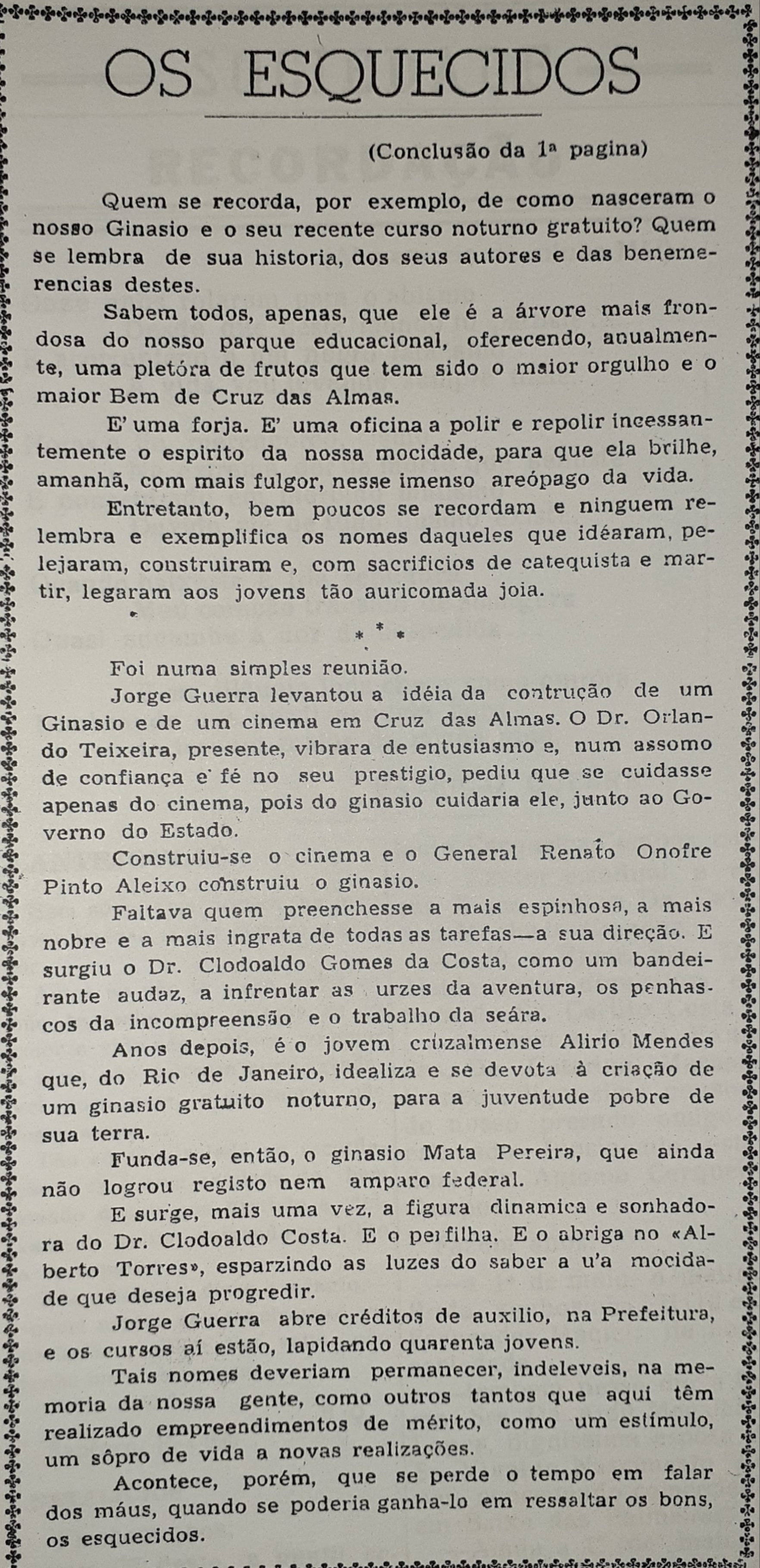 Em 1956, no jornal cruzalmense Nossa Terra, Verdival Pitanga escreveu sobre a História do Ginásio Alberto Tôrres…