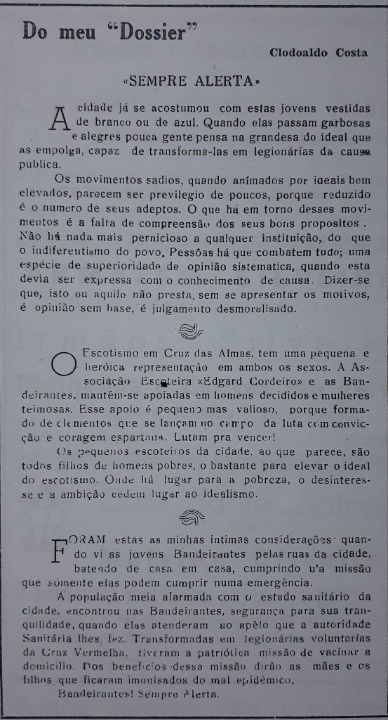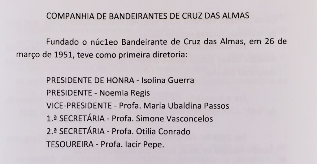 Em Cruz das Almas, em 1951 o Movimento Bandeirante, formado só por garotas, antecedeu o Grupo de Escoteiros, criado em 1953, formado majoritariamente por garotos?