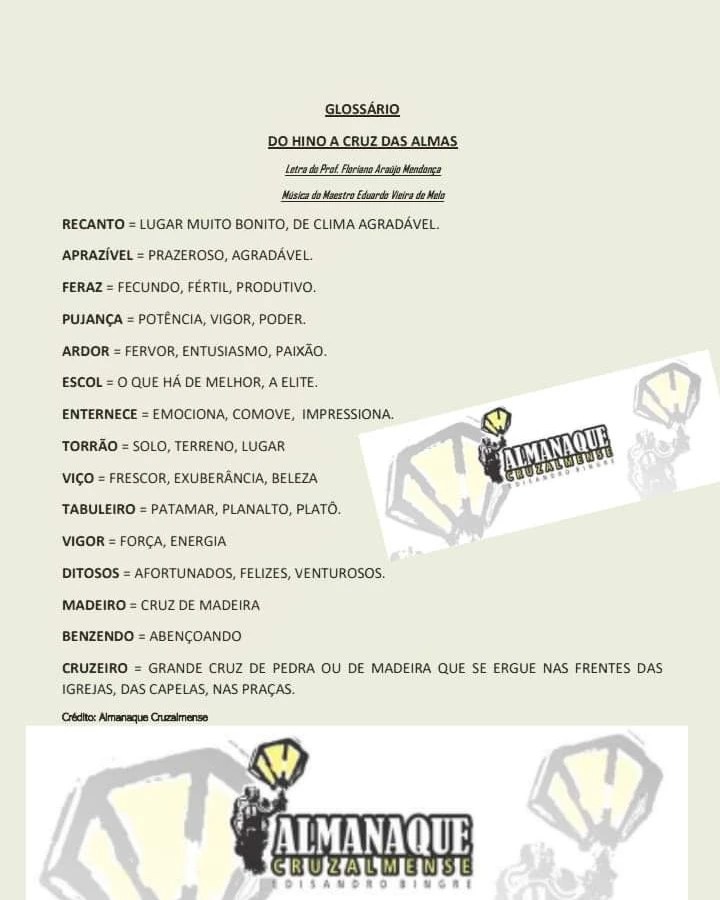 Mesmo que você já tenha ouvido e cantado o belo Hino a Cruz das Almas muitas vezes, deve ter alguma palavra que você desconheça e fica difícil de entender o significado. Por isso, o Almanaque Cruzalmense decifrou para você essas palavras pouco comuns à nossa fala do dia-a-dia e que vem de um estilo mais poético, para assim facilitar o seu entendimento.