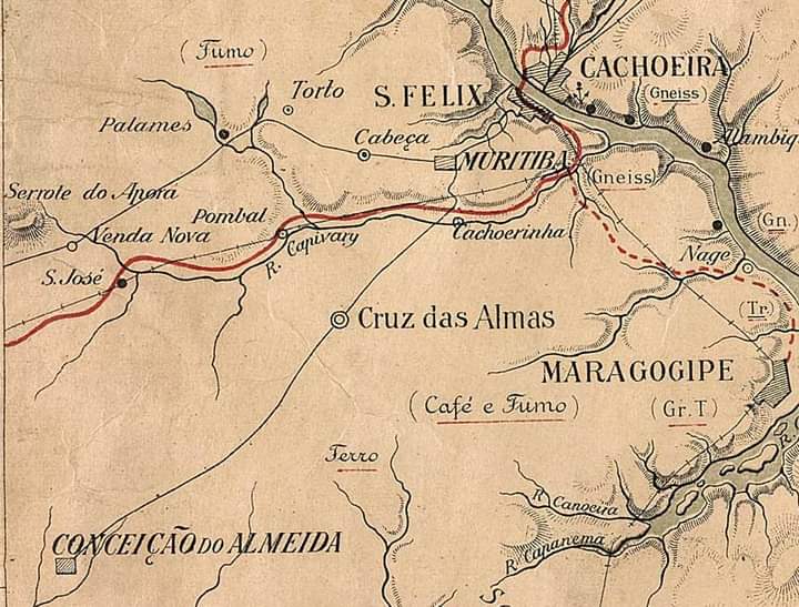 Mapa elaborado por Theodoro Sampaio abarcando a região de Cruz das Almas