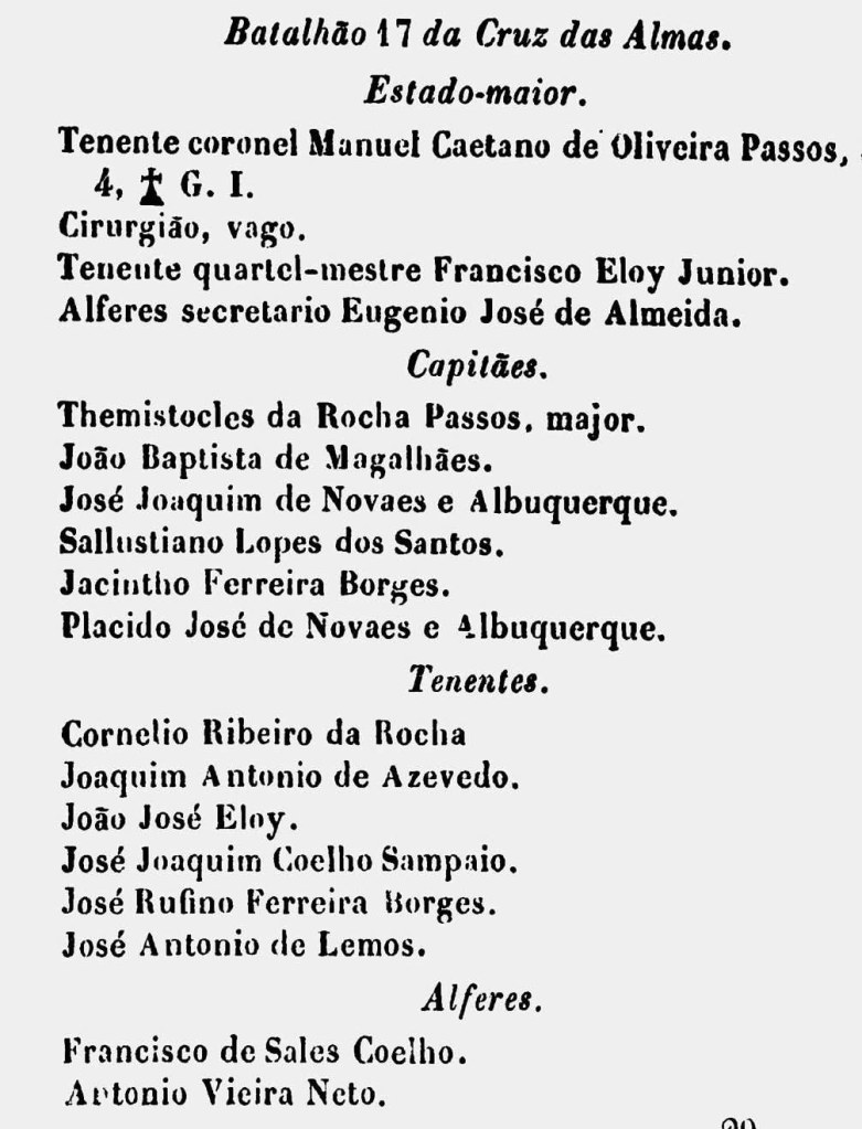 A chamada História Oficial de Cruz das Almas repete, com certo ufanismo, que tanto Manoel Caetano de Oliveira Passos “o Velho” quanto seu filho Themístocles da Rocha Passos, considerados os patriarcas da cidade, foram membros da Guarda Nacional no período do Império do Brazil (com “z” mesmo, conforme grafia da época), alcançando as patentes de Tenente-Coronel e Major, respectivamente, chegando a comandar o Batalhão 17 em 1862, no então distrito de Cruz das Almas. É um dado que costuma ser celebrado como sinal de prestígio e influência.